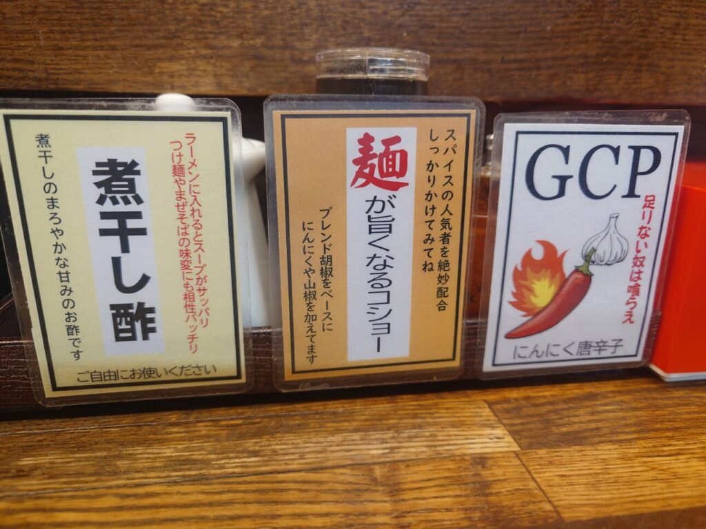 GCPはニンニク唐辛子のようです。本店には無かったですね。
