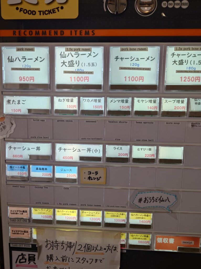 この日のオーダーは『仙八ラーメン(120g)+ライス』入口の券売機で購入します。