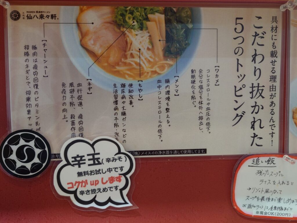 仙八来々軒のラーメンの説明とトッピングの効果の説明が掲示されています。