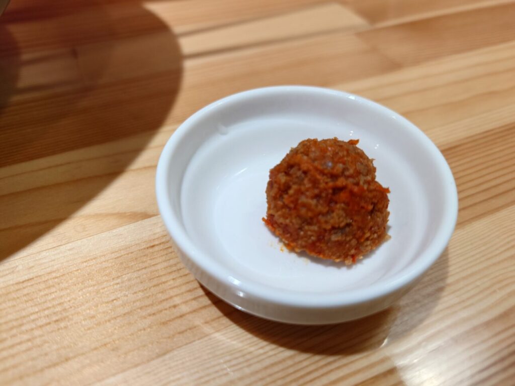 豆板醬が効いた肉みそっぽい感じかな?濃厚スープに辛味が加わり、良いアクセントとなりました。もし辛さが苦手で無かったら試してみてください。