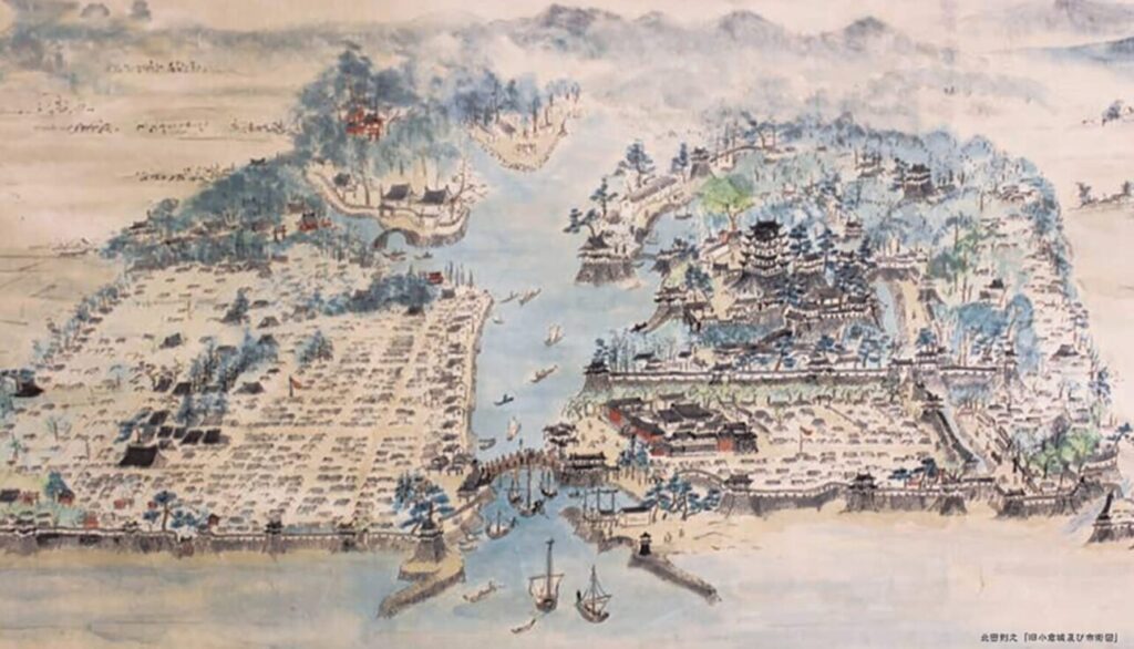 細川忠興が築いた小倉城は、城下町全体を城郭とする壮大な都市計画のもとで建設されました。全国で五番目の規模を誇り、西日本では姫路城に匹敵する巨大な城郭でした。特に九州では群を抜く大きさで、熊本城の約2倍の規模を誇りました。