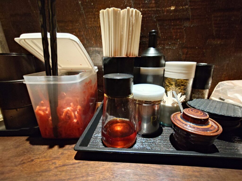 紅ショウガ、胡椒、胡麻、ニンニク、ふりかけ、餃子のタレ、ラー油🧂
