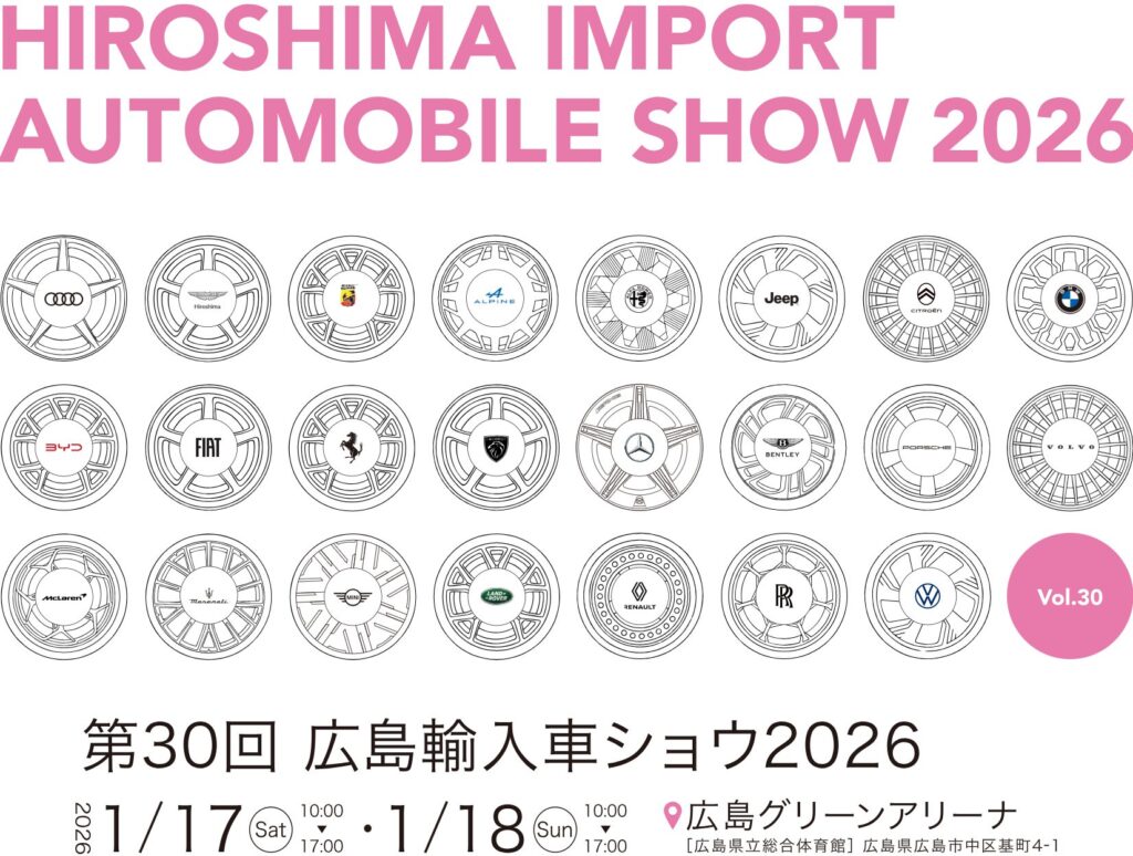 The 30th Hiroshima Import Car Show 2026 will be held at Hiroshima Green Arena on January 17th (Sat) and 18th (Sun).